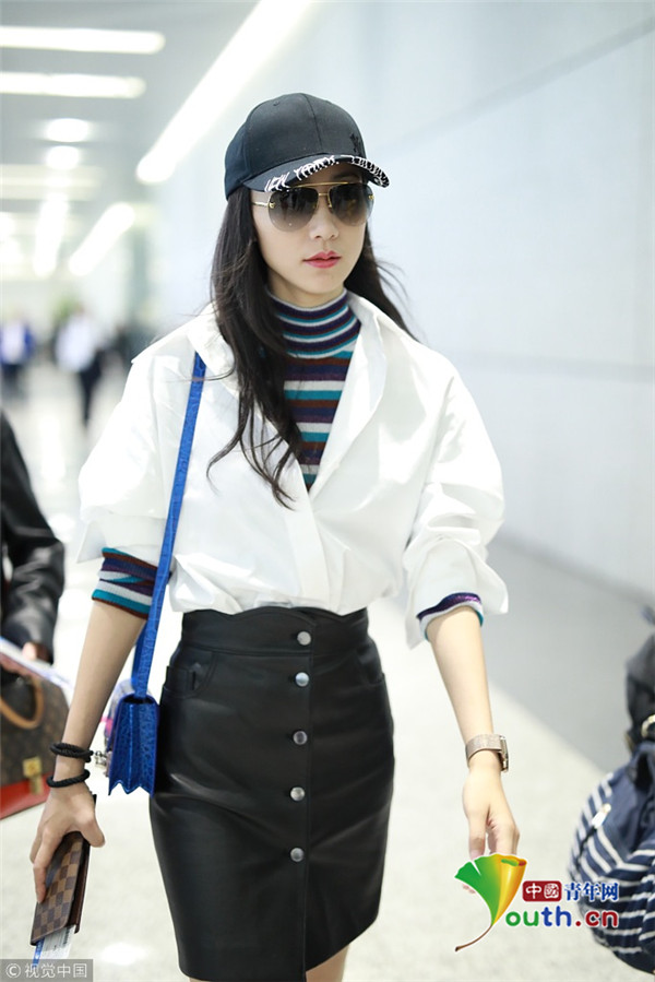 韓雪襯衫短裙清新養(yǎng)眼 帥氣邁步自提行李親和力足