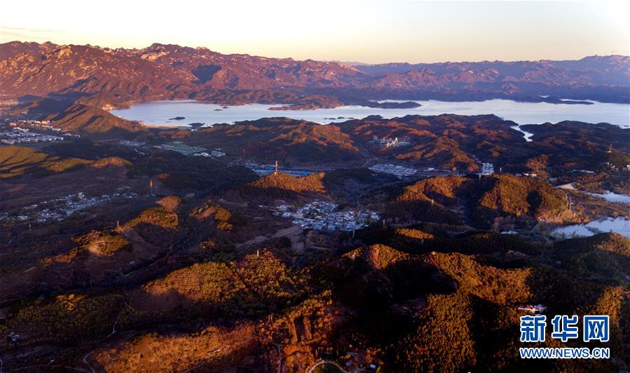 陽光照在北京密云水庫旁的山野上(10月30日無人機(jī)拍攝)。