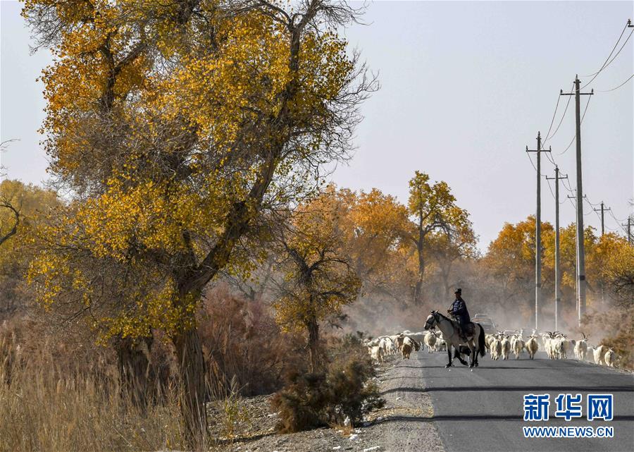 在新疆巴音郭楞蒙古自治州尉犁縣喀爾曲尕鄉(xiāng)的胡楊林里,牧羊人馬木提·買買提在放羊(10月25日攝)。 新華社記者 趙戈 攝
