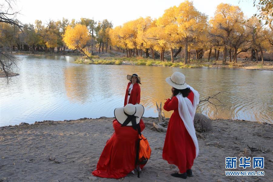 10月10日,在內蒙古自治區(qū)額濟納旗,游客在胡楊林前留影。 金秋時節(jié),內蒙古自治區(qū)額濟納旗胡楊林如同披上金裝,成為大漠中的一抹亮色,吸引眾多中外游客前來觀賞游玩。 新華社記者安希雅攝