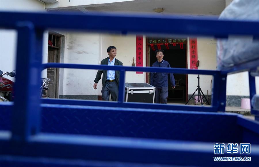 10月30日,曾紀(jì)連(右)和家人將電影放映設(shè)備裝入三輪車,準(zhǔn)備進(jìn)村放映電影。新華社記者 胡晨歡攝