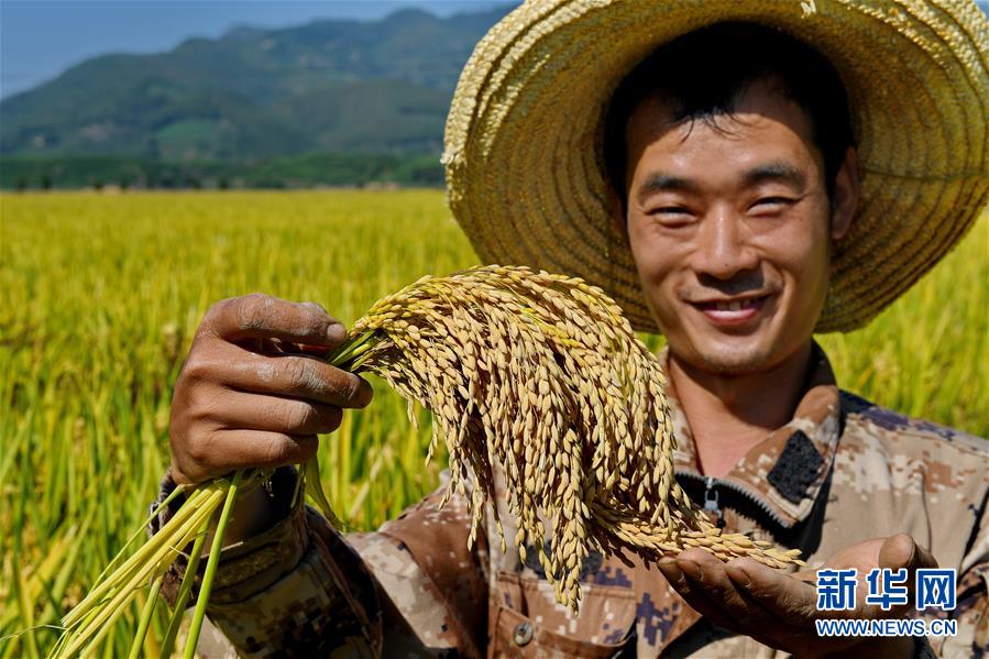 10月31日,武夷山市興田鎮(zhèn)南岸村農(nóng)民在展示稻穗。