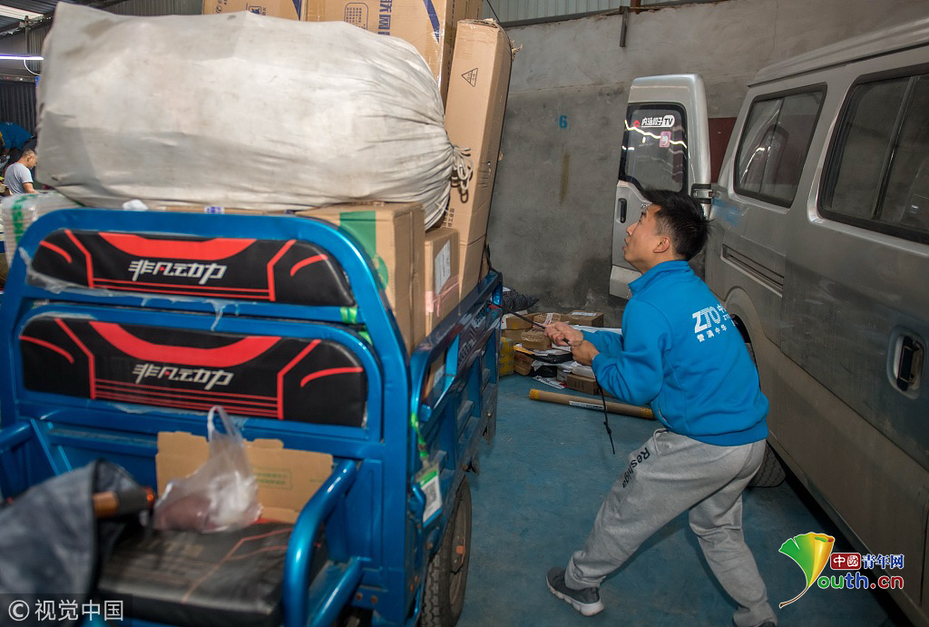 2018年10月16日,攝影師實拍90后快遞員熊忠桃的一天工作。圖片作者:銳圖