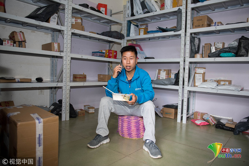 2018年10月16日,云南省昆明市,攝影師實拍90后快遞員熊忠桃的一天工作。作為一名快遞員,他25歲就買了房,9月份收入3萬多。圖片作者:銳圖