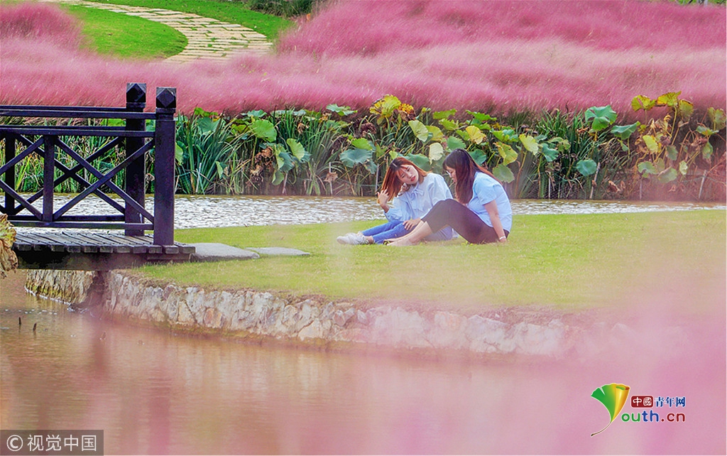 由于這些粉色亂子草圍繞一個(gè)圓形的池塘種植,從空中俯瞰則是另外一番景象,湖心島、池塘,粉黛、草坪與周邊的綠色植物形成了一個(gè)特別的唯美圖案。