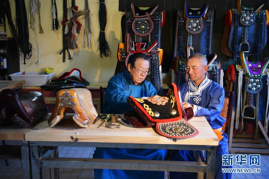 10月31日,在內(nèi)蒙古自治區(qū)通遼市科爾沁左翼后旗,套格敦白乙(左)向徒弟關(guān)嘎扎布傳授制作馬鞍的技巧。新華社記者鄒予攝