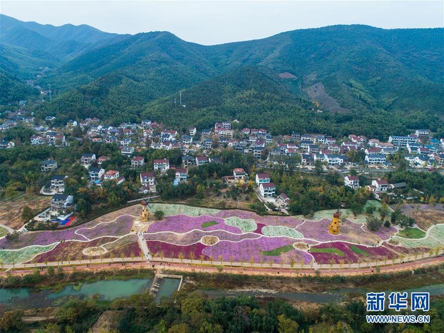 11月2日,空中俯瞰小浦鎮(zhèn)的“五彩花?!?,多彩的花海與金黃的銀杏林構成了一幅美麗的秋季風景(無人機拍攝)。 新華社記者 徐昱 攝
