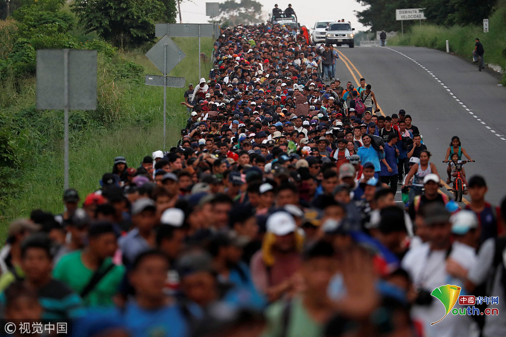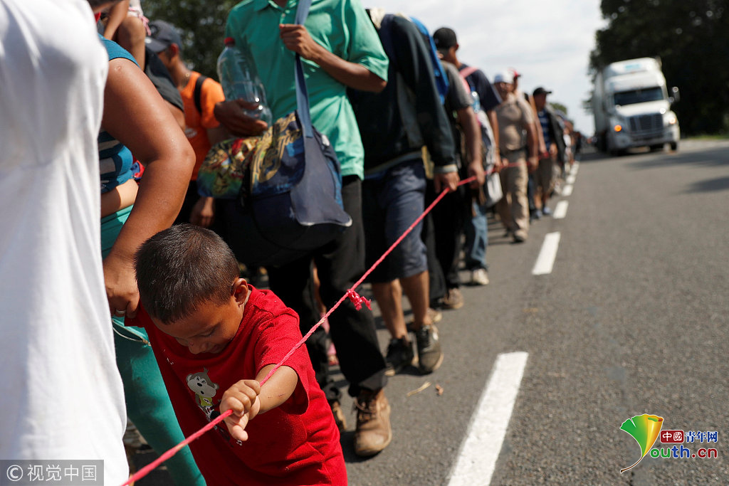 當(dāng)?shù)貢r(shí)間2018年11月2日,墨西哥連接Ciudad Hidalgo與塔帕丘拉的公路上,中美洲移民繼續(xù)向美國(guó)挺進(jìn)。圖片作者:CARLOS GARCIA RAWLINS