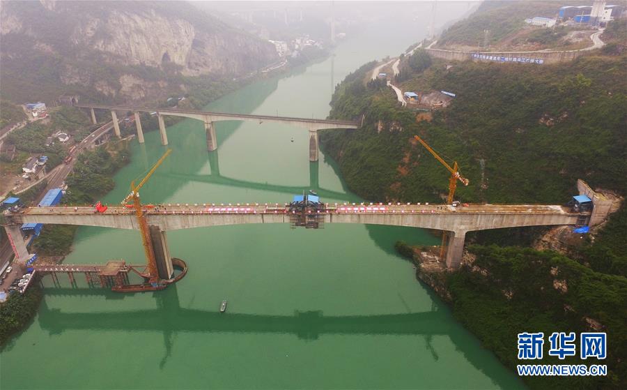 在重慶涪陵拍攝的渝懷鐵路涪秀二線重點工程——烏江右線大橋(10月23日無人機(jī)拍攝)。 10月23日,由中鐵四局承建的渝懷鐵路涪秀二線重點工程——烏江右線大橋主跨成功合龍,標(biāo)志著大橋主體工程全部順利結(jié)束。烏江右線大橋項目全程460.1米,主跨192米,跨越烏江和319國道。在兩年多的建設(shè)過程中,施工人員攻克了“不等高墩”“不對稱邊跨”“邊跨入隧”等多個技術(shù)難題。 新華社記者王全超攝