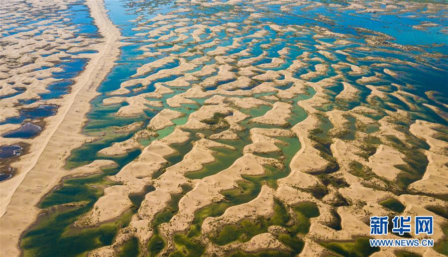 在內(nèi)蒙古鄂爾多斯市杭錦旗境內(nèi)的庫(kù)布其沙漠腹地,由凌汛期的黃河水匯聚而成的濕地在日光照射下顯示出絢麗多彩的顏色(6月9日無(wú)人機(jī)拍攝)。