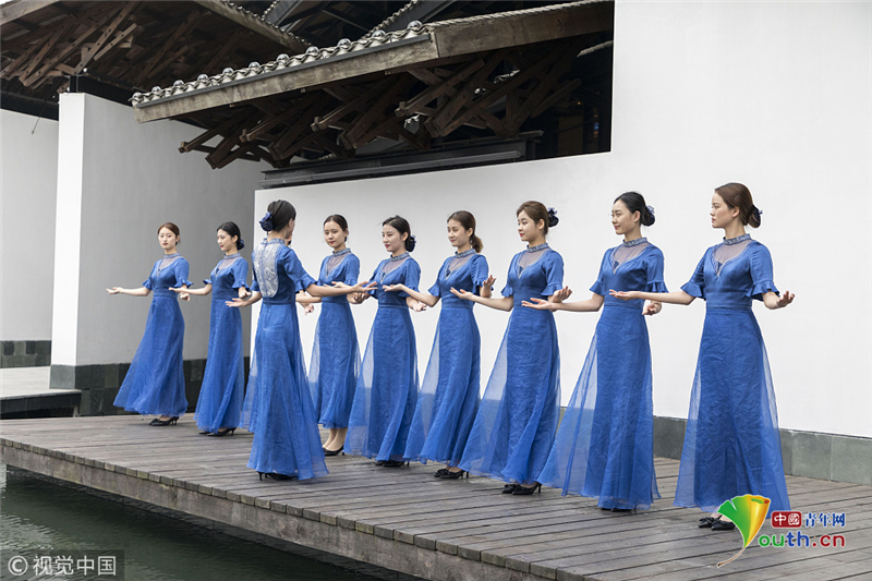 2014年11月17日,世界互聯(lián)網(wǎng)大會直播演練在浙江烏鎮(zhèn)舉行。來自浙江傳媒學(xué)院的大學(xué)生們,身著一襲青花瓷紋旗袍亮相,顯得分外嫵媚,引人注目。