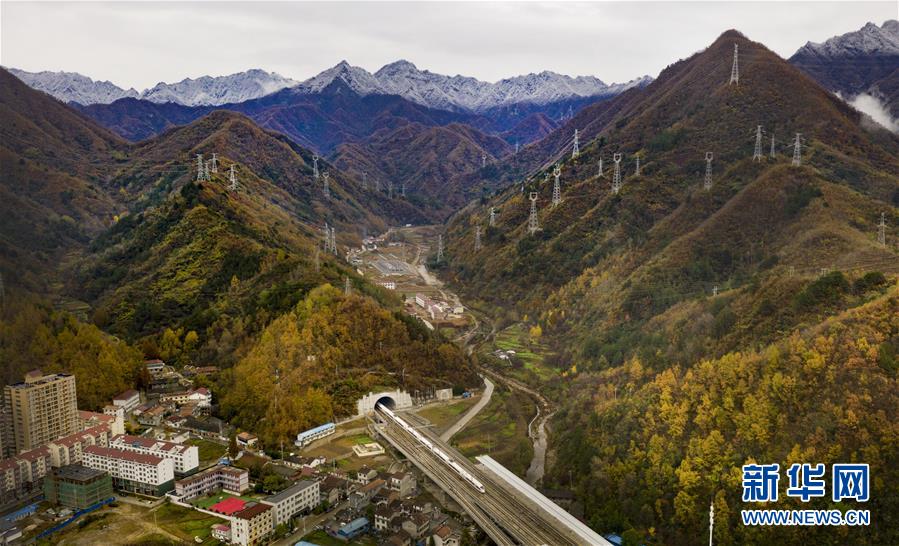 11月5日,一列動車從陜西省漢中市佛坪站駛過(無人機(jī)拍攝)。 新華社記者陶明攝