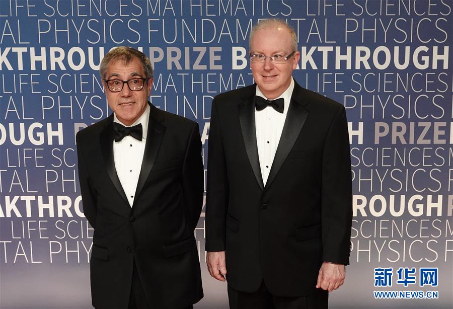 11月4日,在美國舊金山灣區(qū),獲得“基礎物理學突破獎”的查爾斯·凱恩(右)和尤金·梅林出席紅毯儀式。 新華社記者吳曉凌攝