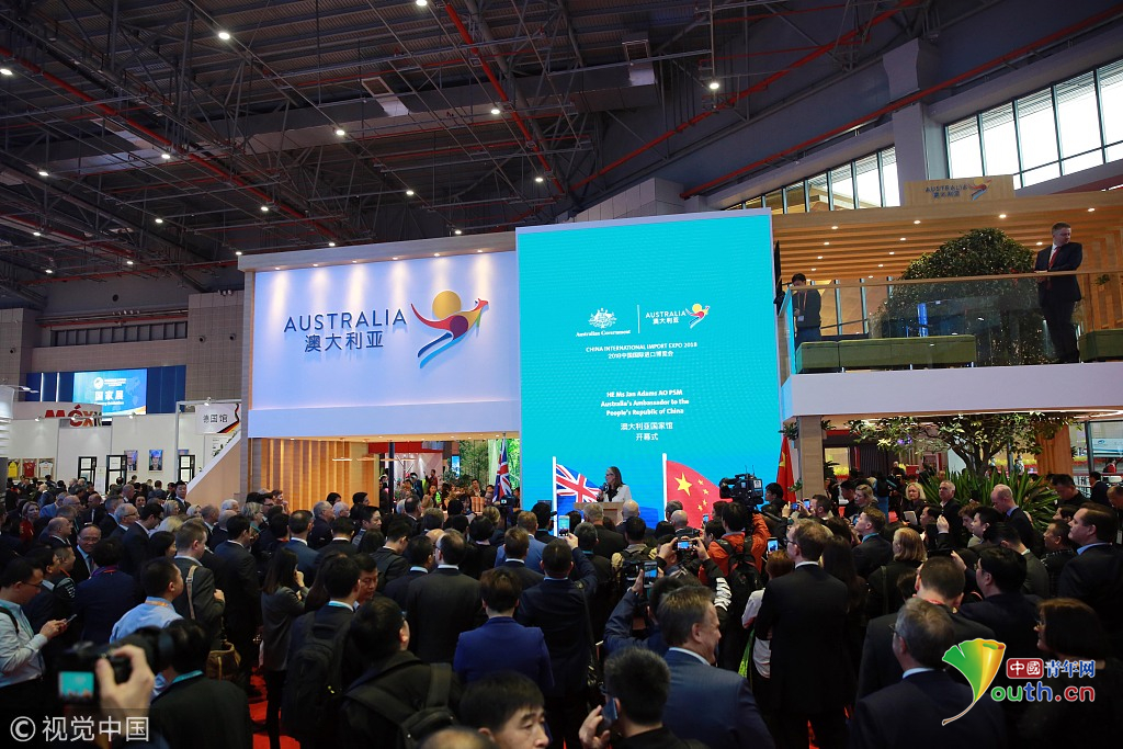 2018年11月6日,上海,首屆中國國際進口博覽會國家展上,共有82個國家、3個國際組織設立了71個展臺。澳大利亞館新產品、新技術發(fā)布。視覺中國