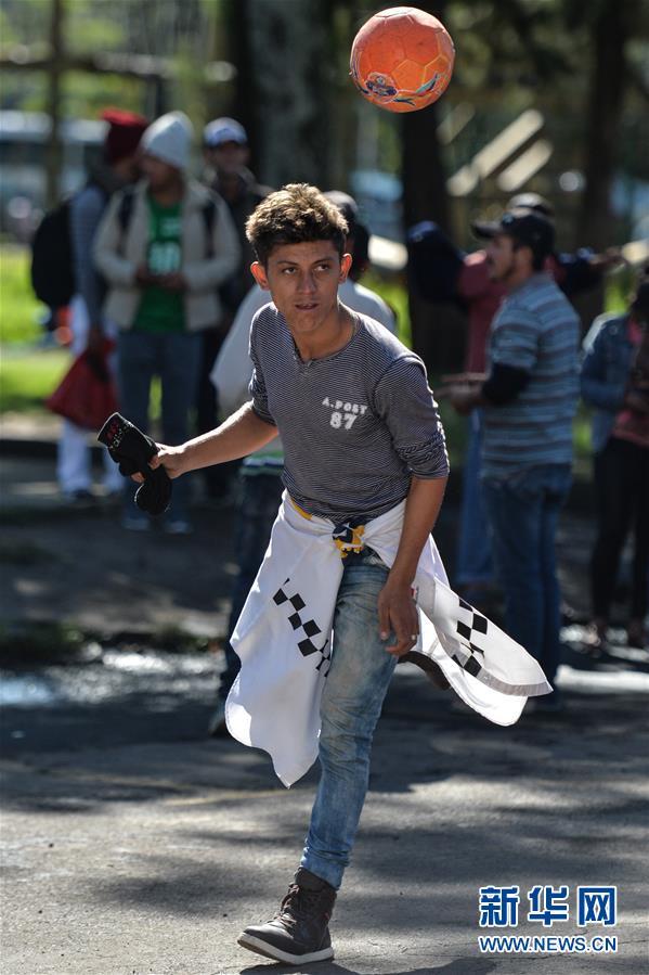 11月5日,在墨西哥首都墨西哥城,一名中美洲移民在臨時(shí)安置點(diǎn)踢足球。 新華社記者辛悅衛(wèi) 攝