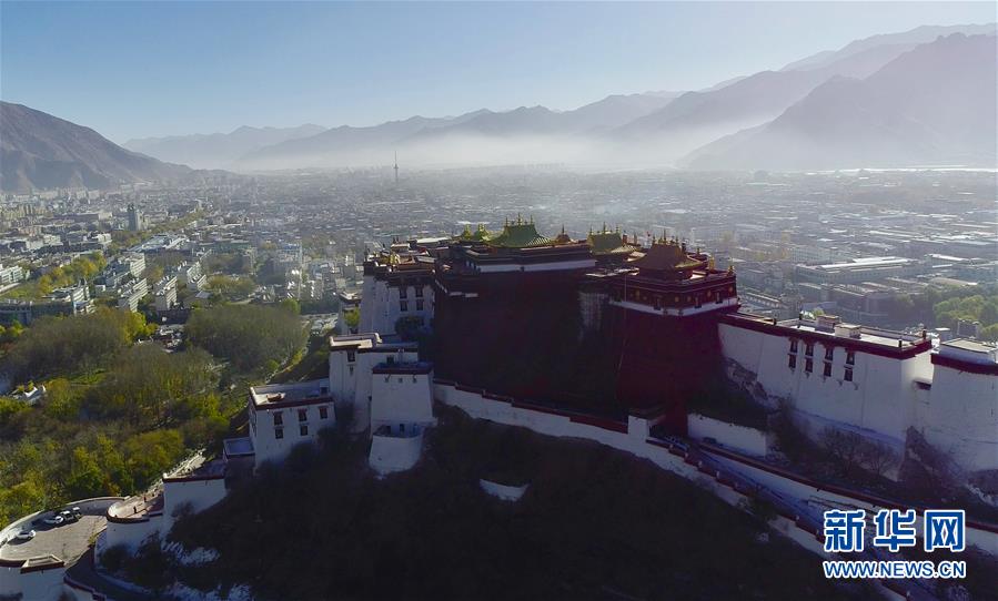 修繕后的布達(dá)拉宮金頂群(11月7日無(wú)人機(jī)拍攝)。