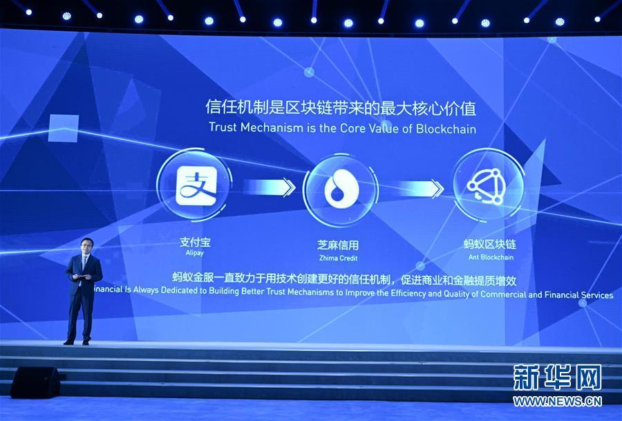 11月7日,螞蟻金服首席執(zhí)行官井賢棟在介紹螞蟻金服金融級(jí)商用區(qū)塊鏈平臺(tái)。新華社記者陳曄華攝