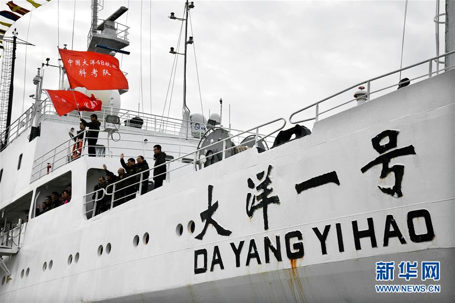 11月7日,科考隊(duì)員在“大洋一號”上向前來迎接的人群揮手致意。 新華社記者 李紫恒 攝
