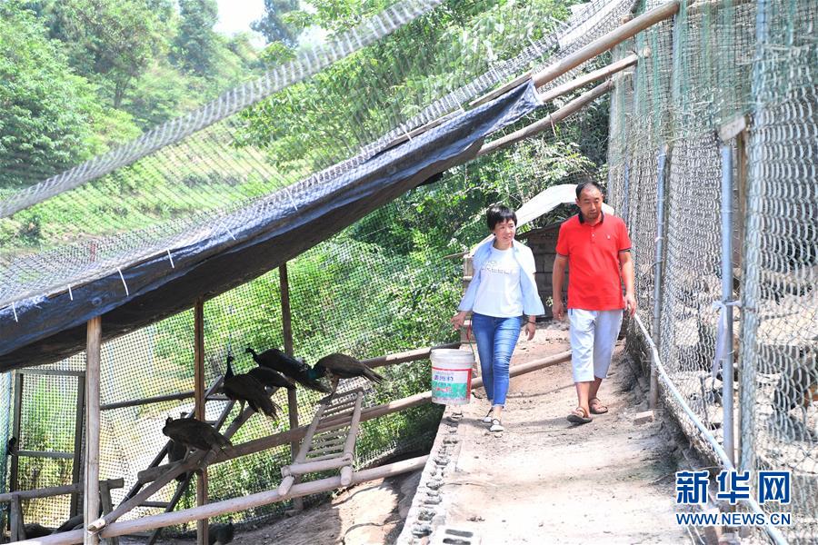 5月16日,在重慶市銅梁區(qū)永嘉鎮(zhèn)高龍村,閻仁兵(右)和妻子張榮蘋在養(yǎng)殖場內(nèi)巡視藍孔雀生長情況。