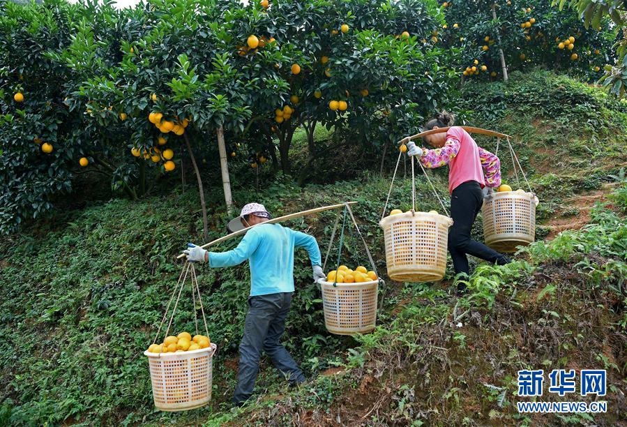 11月11日,江西省尋烏縣澄江鎮(zhèn)周田村的果農(nóng)在挑運(yùn)臍橙。新華社記者 萬象 攝