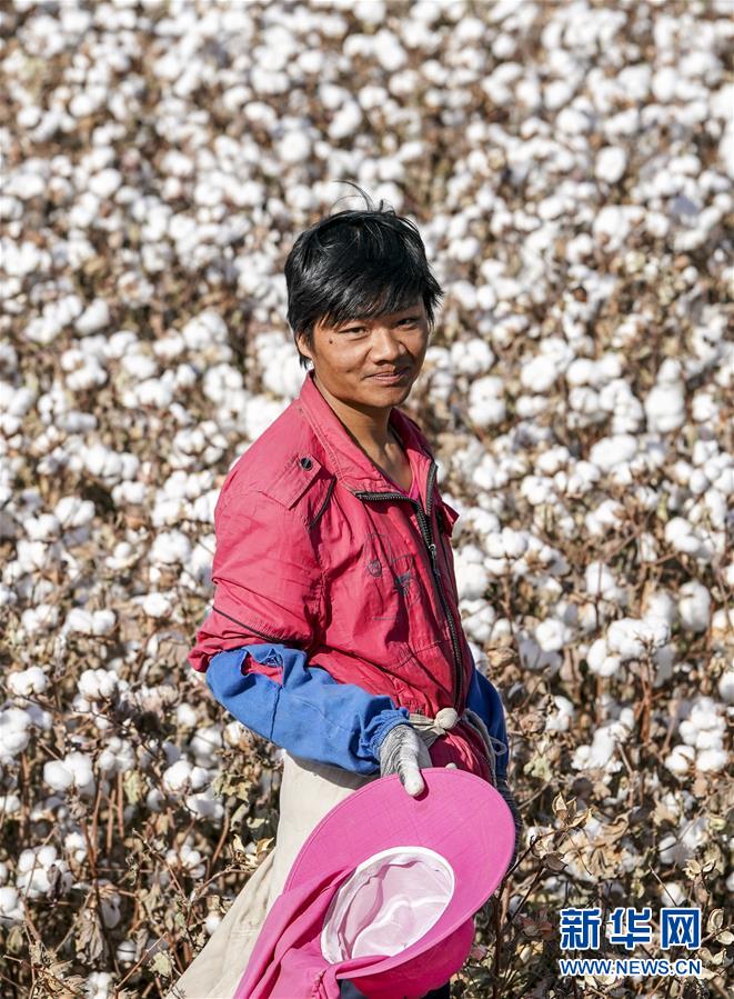 拾花工陳喜波在新疆巴楚縣多來(lái)提巴格鄉(xiāng)卡扎尼塔皮提村的棉田中(10月25日攝)。