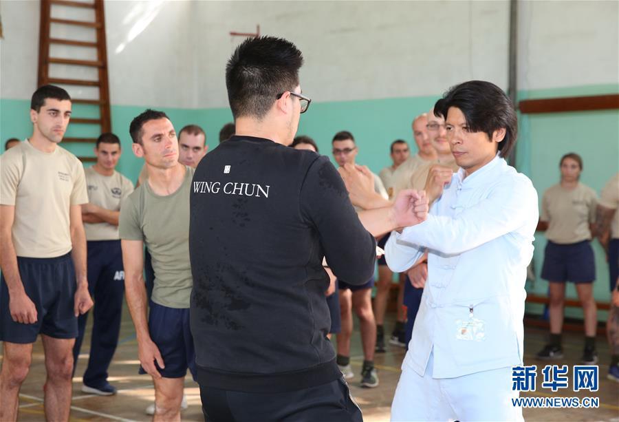 11月13日,在馬耳他首都瓦萊塔,鄭祖杰(前右)向馬耳他士兵展示詠春拳。 當日,中國國家級非物質文化遺產(chǎn)詠春拳代表性傳承人鄭祖杰走進馬耳他武裝部隊,向官兵展示詠春拳。這一活動是馬耳他中國文化中心與馬耳他武術協(xié)會合辦的詠春拳系列展示活動之一。 新華社記者 袁韻 攝