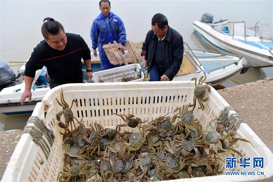 11月6日,在江西省南昌市進賢縣軍山湖大閘蟹養(yǎng)殖水域,當(dāng)?shù)厮a(chǎn)養(yǎng)殖公司的工作人員將捕撈的大閘蟹搬運上岸。 新華社記者彭昭之?dāng)z