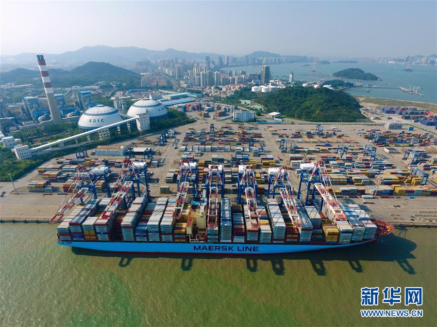 福建自貿(mào)區(qū)廈門片區(qū)海滄嵩嶼碼頭內(nèi),一艘國際集裝箱貨輪在卸貨(2017年5月28日無人機(jī)拍攝)。 新華社記者姜克紅攝