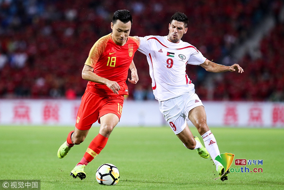 2018年11月20日,??冢?018國際足球友誼賽,中國男足Vs巴勒斯坦。郜林拼搶 圖片作者:null