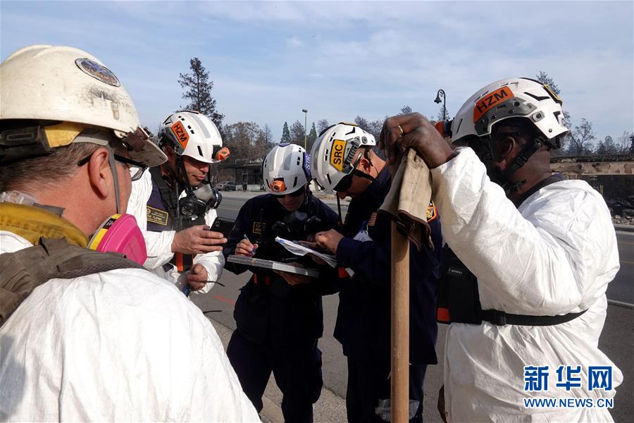 11月20日,在美國加利福尼亞州比尤特縣天堂鎮(zhèn),救援人員在災區(qū)工作。