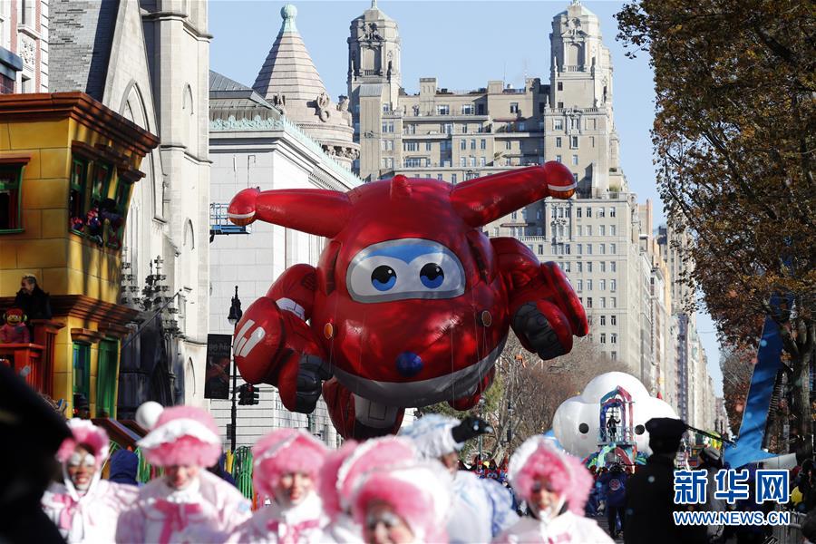 當(dāng)日,第92屆梅西感恩節(jié)大游行在紐約舉行,各式各樣的玩偶?xì)馇颉⒒ㄜ囮犖樵诼D的摩天大樓間穿行,吸引數(shù)百萬民眾前來觀看。梅西感恩節(jié)大游行始于1924年,是全美規(guī)模最大的感恩節(jié)游行。