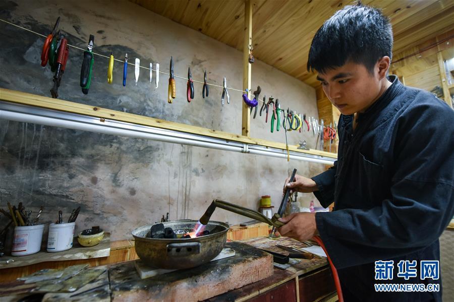 龍懂陽的弟弟龍?zhí)栆彩倾y飾工藝傳人。和哥哥不同,弟弟主打的是銀飾文化體驗游,用自家傳統(tǒng)苗寨開設民宿,游客在此居住的同時,還能學習體驗銀飾品制作。每年暑期一到,家長孩子絡繹不絕。新客源、新銷路、新模式帶動雷山縣銀飾業(yè)不斷發(fā)展壯大,成為脫貧攻堅的重要產業(yè)。2017年,雷山縣控拜、麻料、烏高三個村銀飾品及相關產業(yè)銷售額超過1.5億元,吸引很多外出打工的年輕人回家創(chuàng)業(yè)。苗寨鍛銀聲在綠水青山間響遍千戶,也漸漸走出大山,聲名遠播。新華社記者 李芒茫 攝