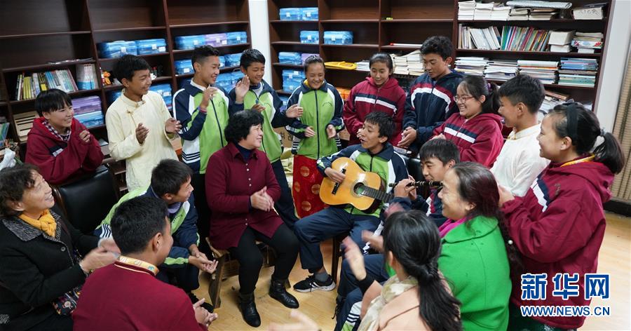11月16日,南昌市第十七中學西藏班的學生為劉和平(中間紅衣者)及“愛心媽媽志愿服務團”成員表演彈唱。新華社記者 胡晨歡 攝