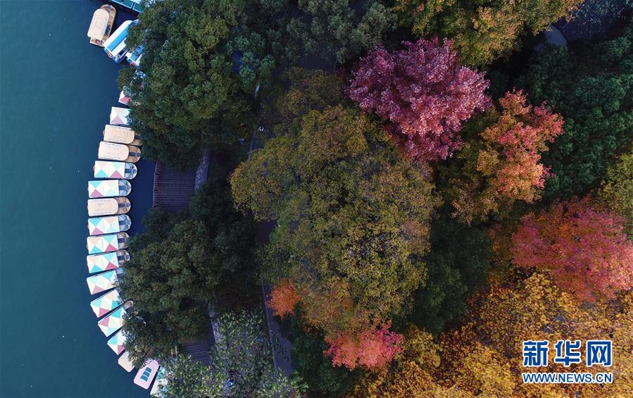 一排游船停泊在湖南烈士公園年嘉湖湖畔(11月25日無人機(jī)拍攝)。 新華社記者 李尕?cái)z