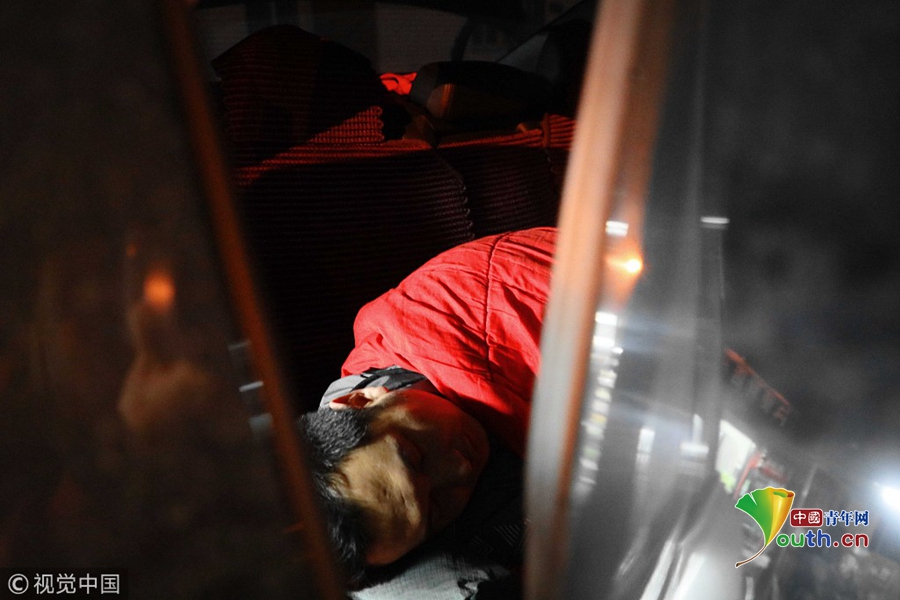 2018年11月17日,北京,由于醫(yī)院只允許一名家長陪護,醫(yī)院門口的日租房又很貴,袁東方不舍得花錢,只好借住在病友的車內。魏建順/視覺中國