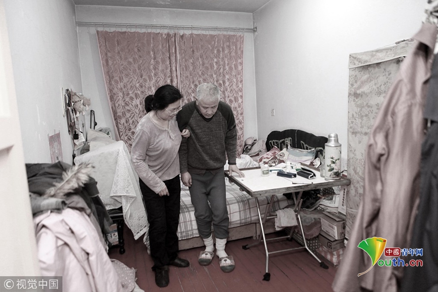 2018年11月22日,遼寧丹東,在出租屋內,袁東方的母親正在攙扶著老伴兒鍛煉身體。魏建順/視覺中國