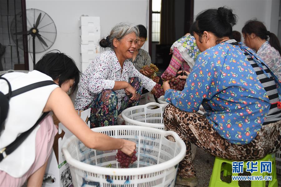 下姜村村民將剛采摘的葡萄挑揀裝箱(2017年8月9日攝)。下姜村用流轉(zhuǎn)的土地建成葡萄園、草莓園、茶葉園、中藥材園等產(chǎn)業(yè)園區(qū),村民收入實現(xiàn)了“節(jié)節(jié)高”。