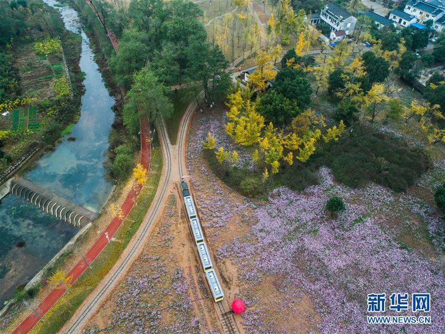 一列觀光小火車帶著游客穿行在銀杏林和花海之間(11月16日無人機(jī)拍攝)。近日,在浙江省長興縣小浦鎮(zhèn),“十里銀杏長廊”和近千畝花海經(jīng)過近一年的升級改造后,以嶄新的面貌與游客見面。花海、觀光小火車、古村民宿、銀杏長廊等旅游項目全面提升了小浦鎮(zhèn)鄉(xiāng)村旅游的品質(zhì)。新華社記者 徐昱 攝