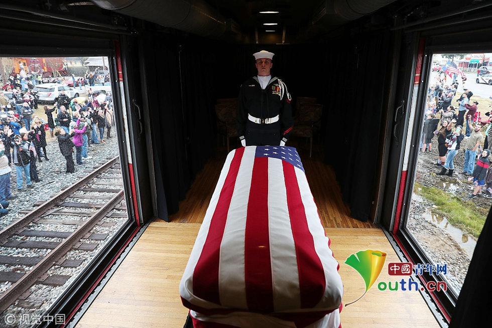 當?shù)貢r間2018年12月6日,美國德州,美國前總統(tǒng)老布什將落葬德州農(nóng)機大學(xué)布什總統(tǒng)圖書館和博物館后面的布什家族墓地,與他半年前去世的妻子芭芭拉以及早夭的女兒蘿賓葬在一起。當天,一輛葬禮專列將載著老布什的棺槨及其親朋,從休斯敦郊區(qū)開往老布什的最后安葬之地、德州農(nóng)機大學(xué)。這列火車的第六節(jié)車廂側(cè)面是透明的,人們可以在鐵軌旁看到老布什蓋著國旗的靈樞。圖片作者:Joe Raedle/視覺中國