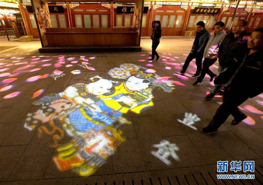 12月4日,游客在楊柳青古鎮(zhèn)步行街上欣賞年畫主題燈光。 近日,天津市西青區(qū)楊柳青古鎮(zhèn)在步行街新增9組以楊柳青年畫代表作為主題的動態(tài)夜景燈光,講述古鎮(zhèn)與年畫的歷史。 新華社記者 岳月偉 攝