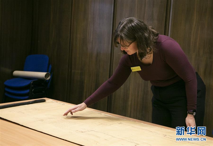 11月2日,在英國(guó)紐卡斯?fàn)柕奶┒鳌枡n案館,檔案管理員瑞秋·吉爾介紹致遠(yuǎn)艦設(shè)計(jì)圖紙。 新華社記者日前在紐卡斯?fàn)柼┒鳌枡n案館查找北洋海軍史料時(shí)發(fā)現(xiàn)一套七張、檔案名為“中國(guó)巡洋艦舵機(jī)設(shè)計(jì)圖”的原始圖紙。塵封百年,甲午海戰(zhàn)中抗擊日艦后沉沒的清北洋海軍致遠(yuǎn)艦部分原廠設(shè)計(jì)圖紙?jiān)谄浣ㄔ斓亍?guó)紐卡斯?fàn)柺械囊患覚n案館首次被發(fā)現(xiàn),為打撈那段悲壯的歷史提供了重要參考。 新華社記者 韓巖 攝
