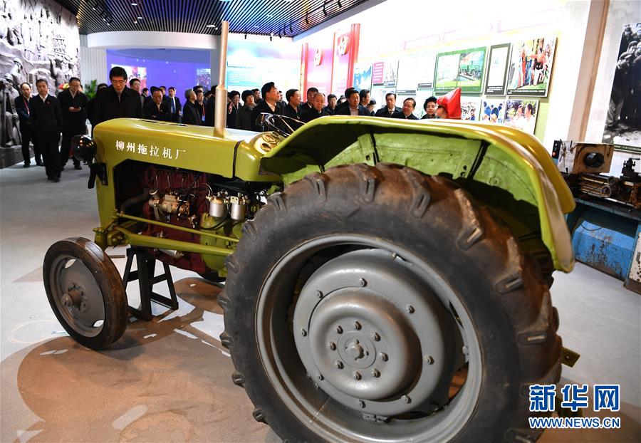 12月10日,觀眾在參觀廣西柳州20世紀(jì)60年代試制成功并生產(chǎn)的拖拉機(jī)。 當(dāng)日,廣西壯族自治區(qū)成立60周年大型成就展在位于南寧的廣西規(guī)劃館開(kāi)幕。 新華社記者 周華 攝