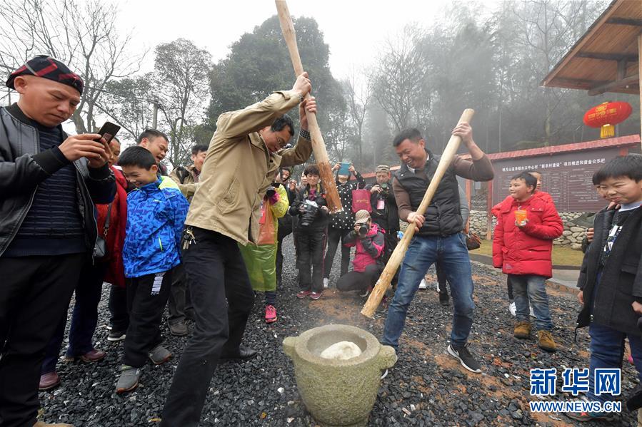 在江西宜春溫湯鎮(zhèn)水口村,游客體驗傳統(tǒng)的打糍粑(3月2日攝)。