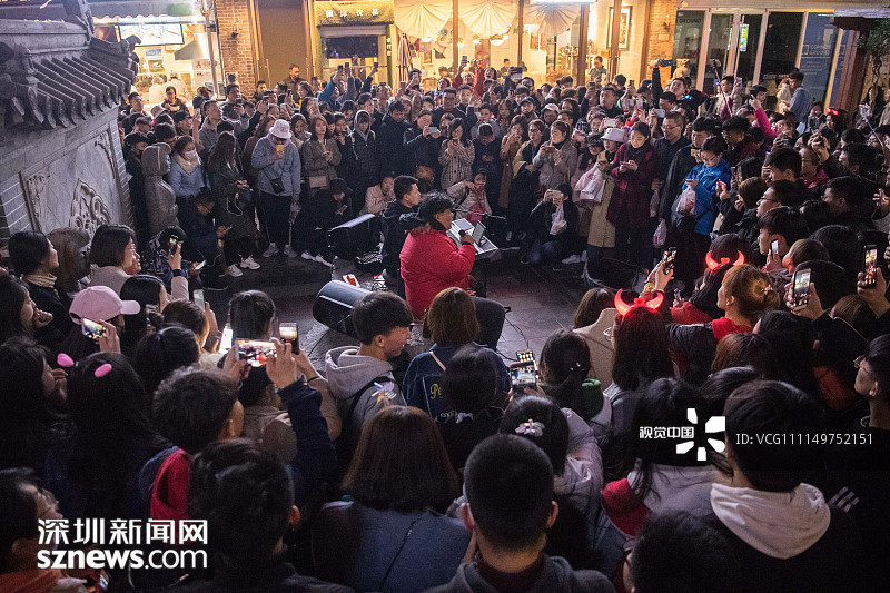 2018年4月6日晚,清明小長(zhǎng)假的第二天,在山東省濟(jì)南市復(fù)古老街區(qū)寬厚里,暫停演出有段時(shí)日的網(wǎng)紅歌唱組合“連音社”悄然復(fù)出,吸引了當(dāng)?shù)匾约皝碜匀珖?guó)各地游客的圍觀。