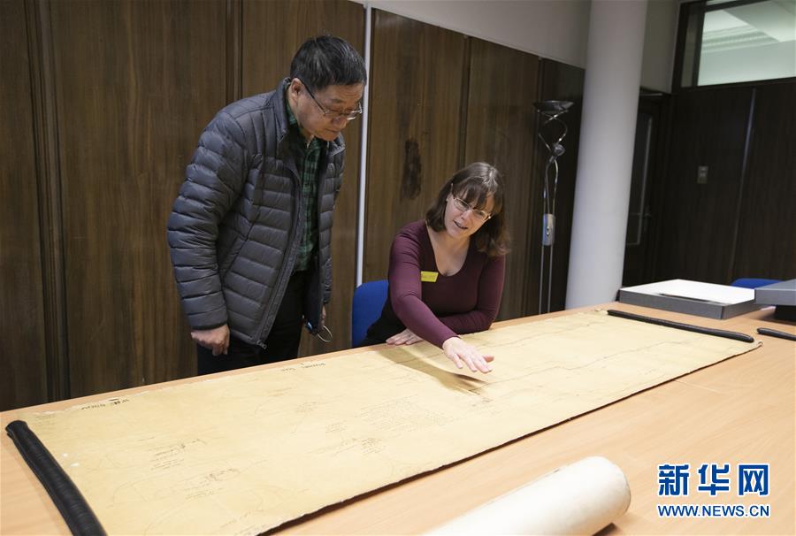 11月2日,在英國紐卡斯?fàn)柕奶┒鳌枡n案館,檔案管理員瑞秋·吉爾(右)向新華社記者介紹致遠(yuǎn)艦設(shè)計圖紙。 新華社記者 韓巖 攝