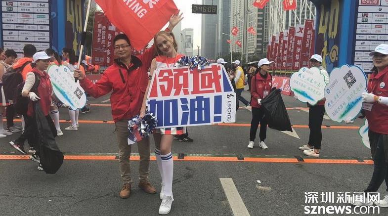 終點處有志愿者與啦啦隊支持者合影留念。