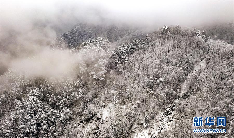 11月8日無人機拍攝的銀裝素裹的鬼谷嶺國家森林公園主峰。 新華社記者陶明攝