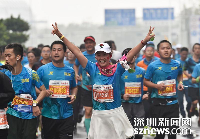 2018年12月16日,深圳國際馬拉松位于后海的折返點(diǎn),即將抵達(dá)終點(diǎn),一名選手歡呼雀躍。