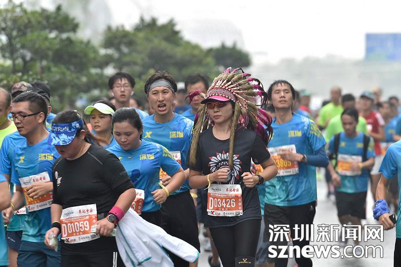 2018年12月16日,深圳國際馬拉松位于后海的折返點(diǎn),一名選手頭戴特色頭飾,向終點(diǎn)沖刺。