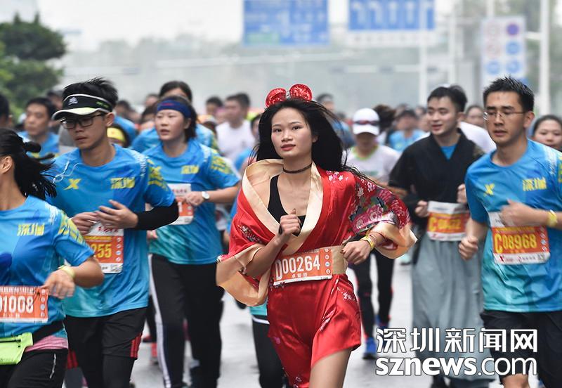 2018年12月16日,深圳國際馬拉松位于后海的折返點,一名選手正在向終點沖刺,跟其他選手不同,本屆比賽有很多參賽者選擇自己穿著特色服裝參賽。